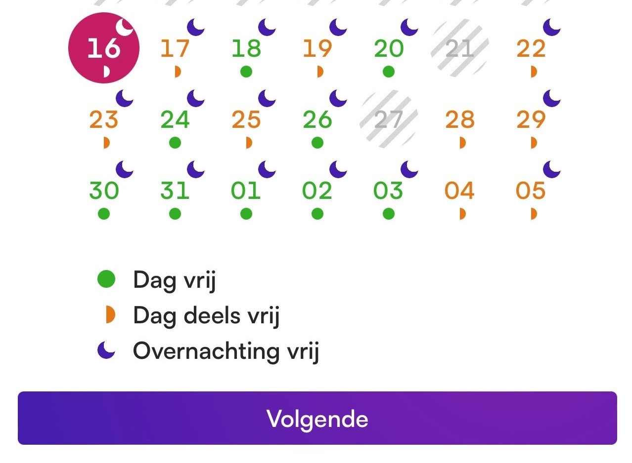 Onder de specials staan de overnachtingen, indien beschikbaar. Datums die met een maan worden gemarkeerd hebben een overnachting voor die specifieke dag.