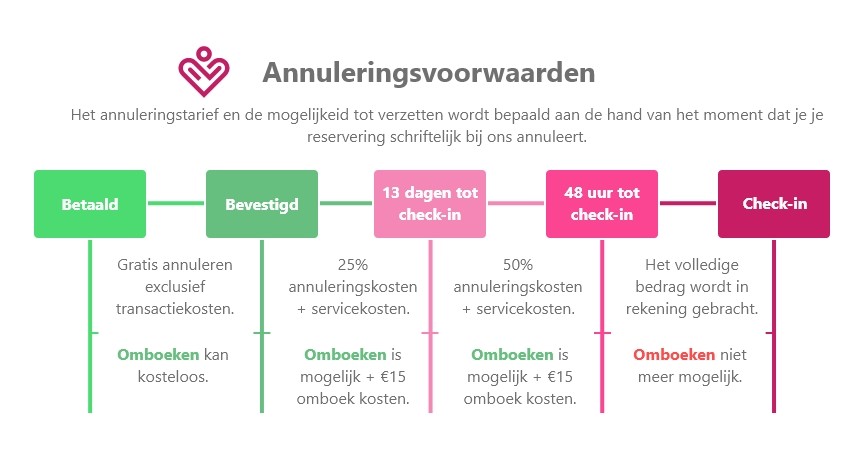 Binnen 48 uur van check-in is omboeken helaas niet meer mogelijk. Als je een reservering een uurtje wil verschuiven, een arrangement wil bijboeken of van ruimte op dezelfde locatie wil wisselen rekenen we daar geen kosten voor.