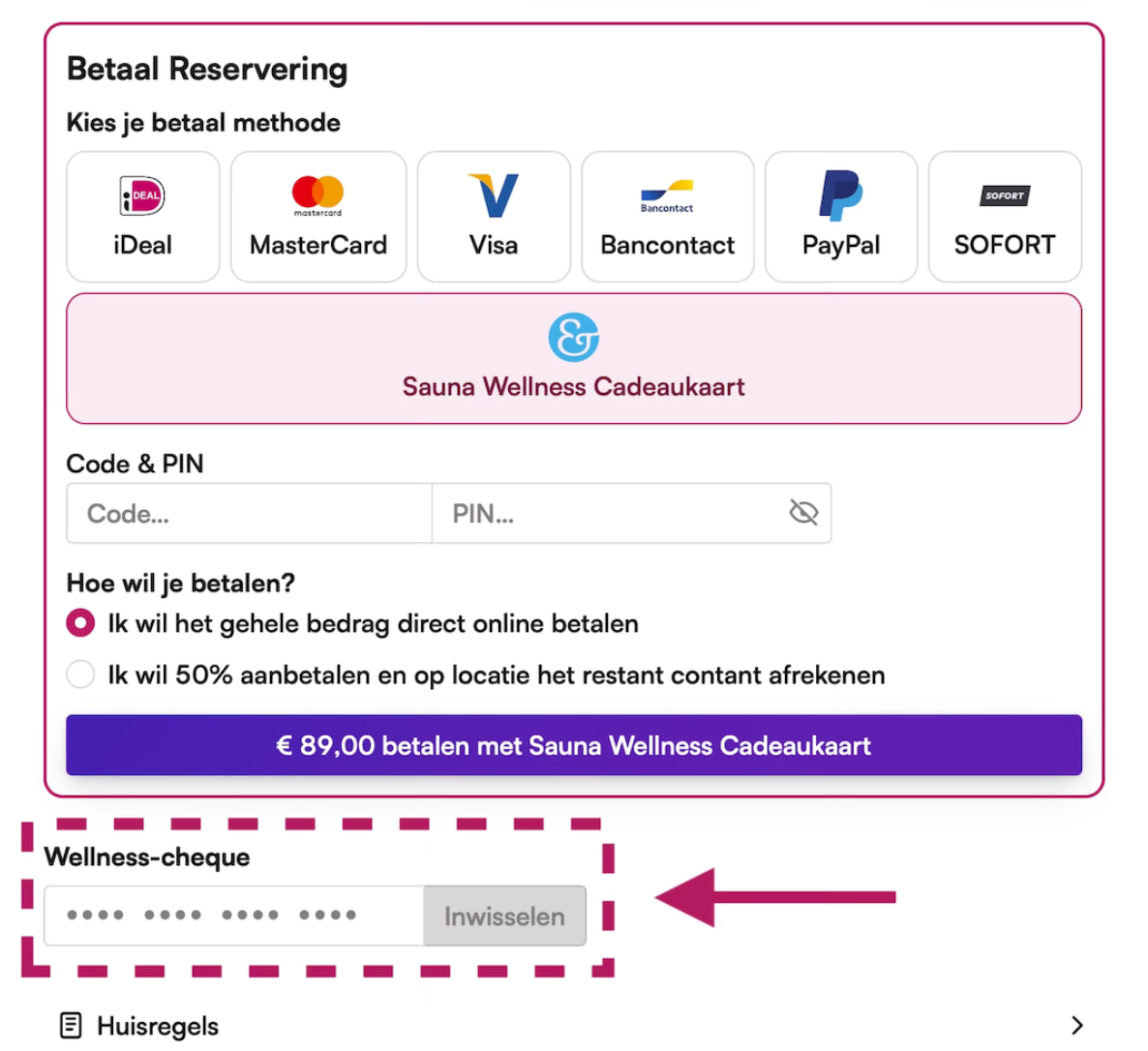 Als je een reservering hebt gemaakt via Privesauna.nl kun je op de betaalpagina de unieke code invullen bij het vakje wellness-cheque. De openstaande waarde wordt dan automatisch verrekend. Let op: Als je voor aanbetalen 50% kiest wordt alleen de aanbetaling afgeschreven.